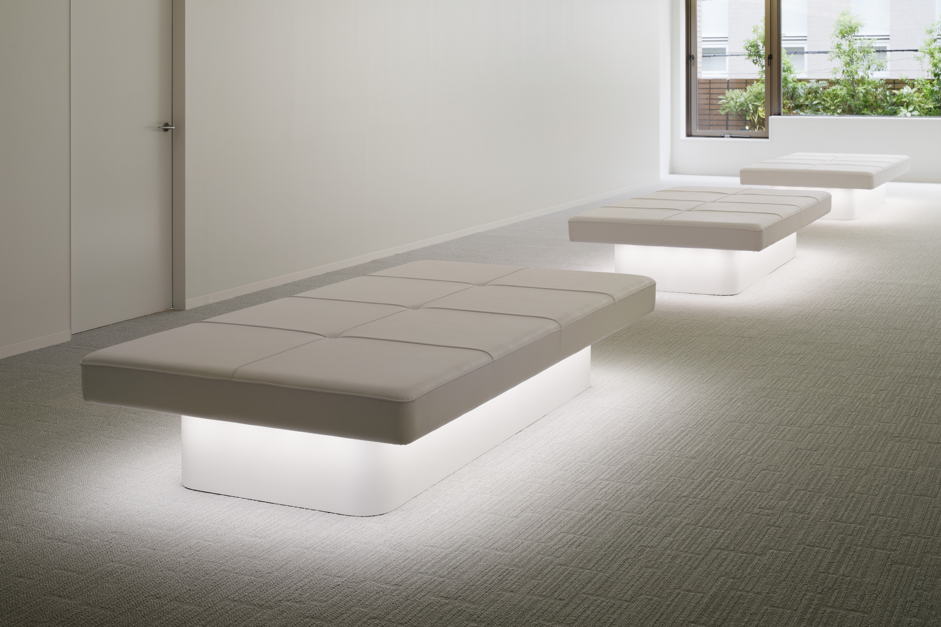 壁面の間接照明と、ソファ什器下の照明としてOLEDをご採用いただきました。壁面の間接は建築側で造作を作らず、KANEKA LUCE ARCHITECTURE® A1 series器具を連続設置するだけという簡易施工で、間接照明空間を実現しております。やわらかな光が空間全体に広がり、上質な空間を創り出しています。