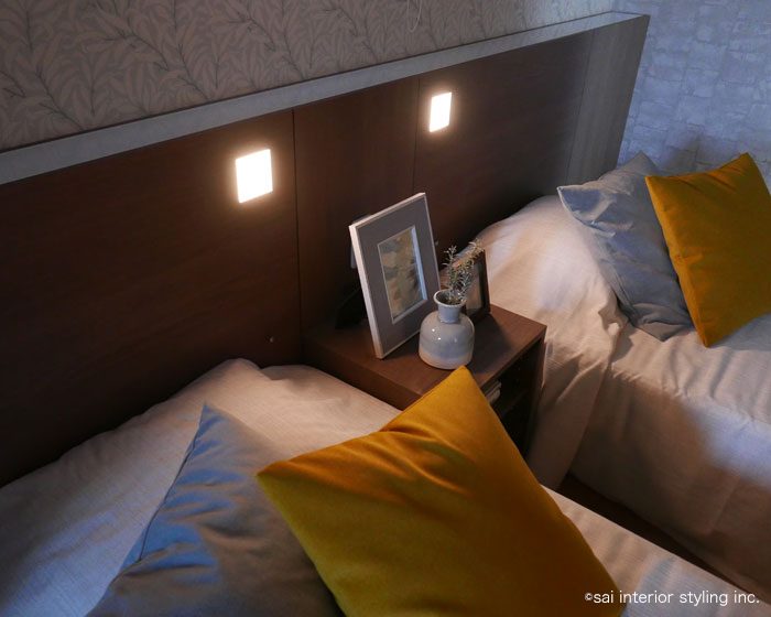 カネカ有機EL照明を高天井間接照明とヘッドボードの上部に使用することにより光過敏症に配慮した空間を実現しました。さらに、枕元の読書灯として、カネカ有機EL照明をヘッドボード内に組み込みました。就寝前にやさしく照らすだけでなく、ナイトテーブル周りに空間の広がりを演出することができました。