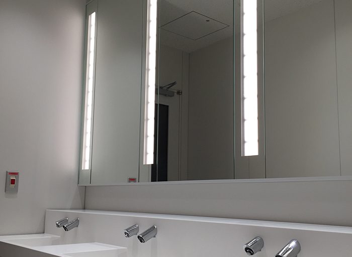 アーク森ビルの1階、2階のトイレ洗面鏡に、カネカ有機EL照明パネル(以下カネカOLED)が組み込まれています。