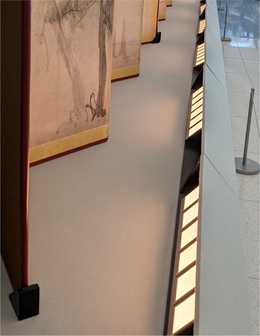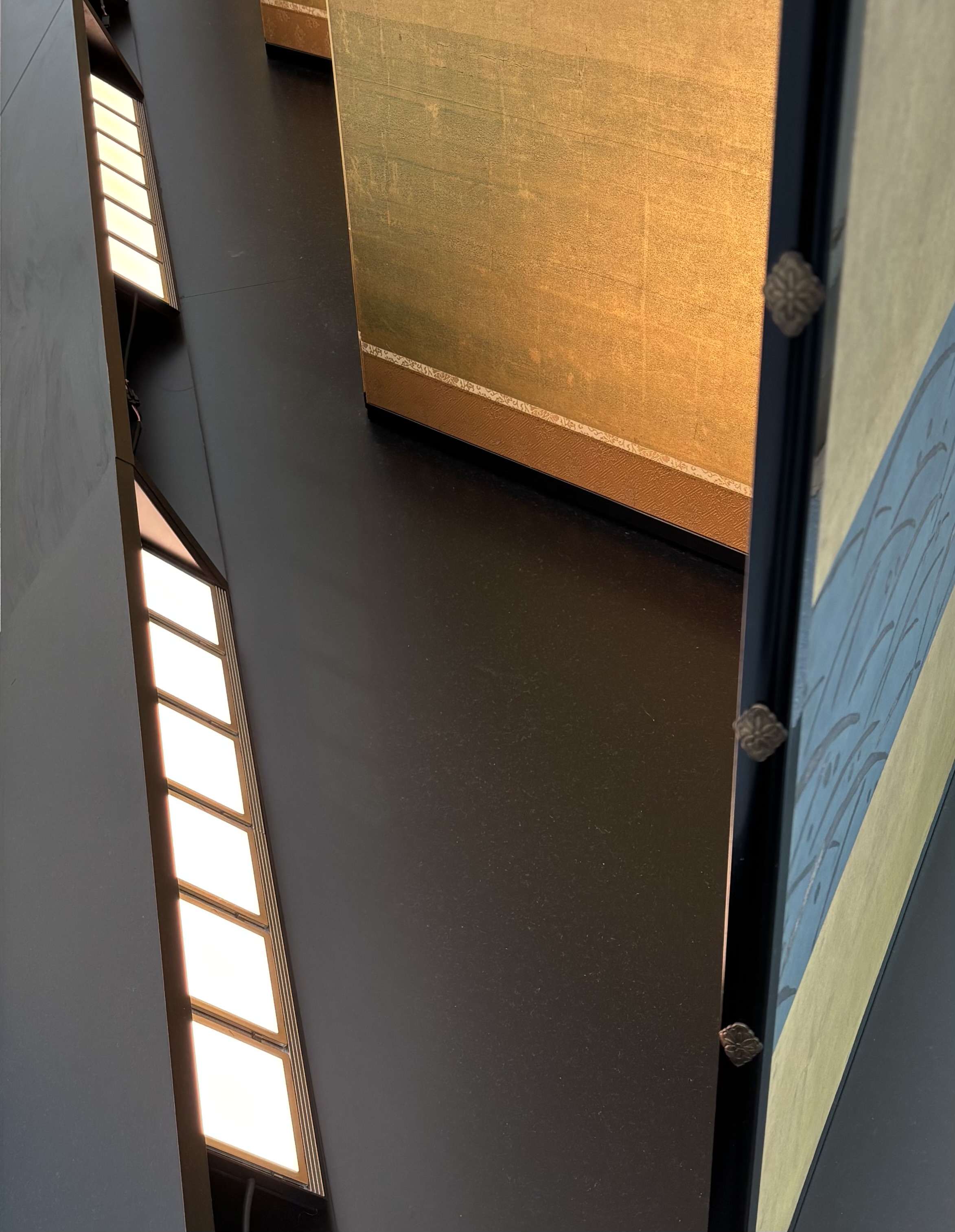 本展示では、東博と同様に、貴重な文化財の高精細複製品をガラスケースなしで間近にご鑑賞いただけます。OLEDの面発光が生み出すやわらかな光と高い演色性により、作品本来の質感や色彩が美しく表現され、文化財の存在感を一層引き立てています。